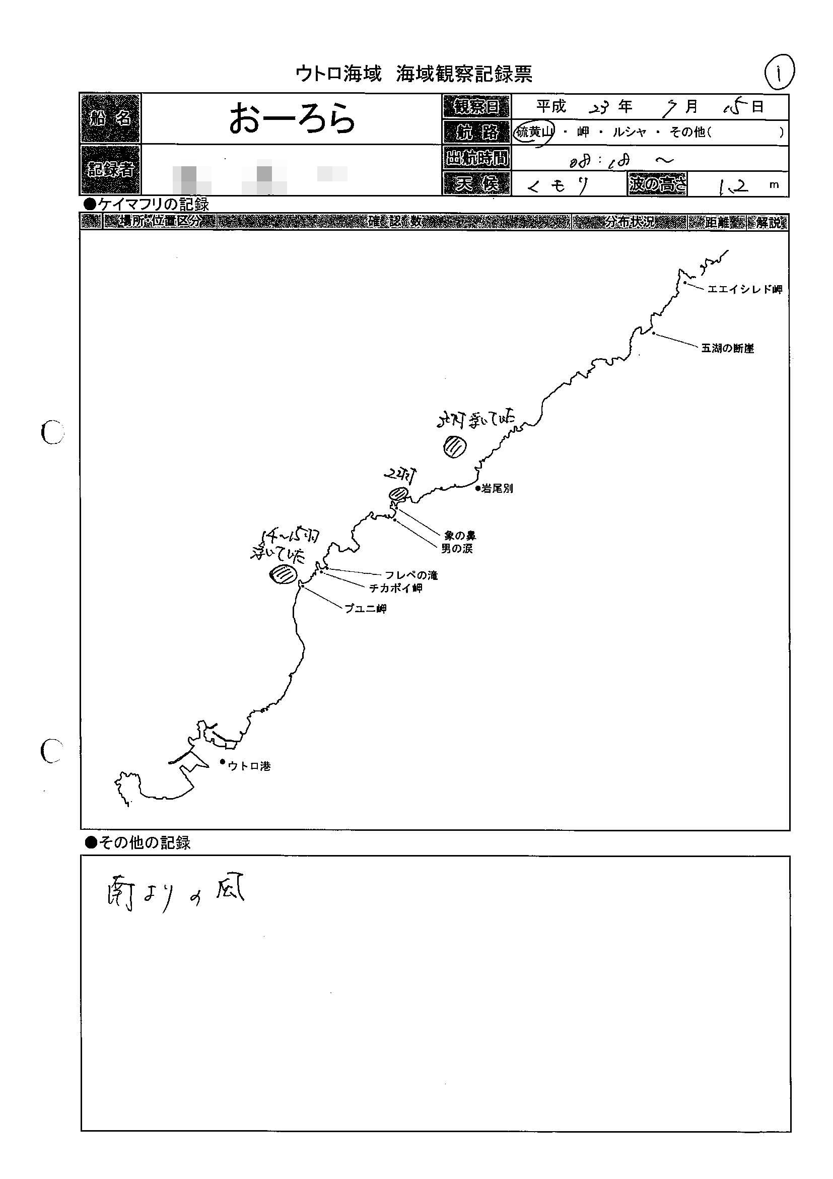 ウトロから出港している大型観光船「おーろら号」(道東観光開発株式会社)では、ケイマフリをはじめ海鳥の繁殖期間中の6月~7月には、運航中の海上に見られる海鳥や海棲哺乳類などの海生生物、沿岸に見られるヒグマなどの観察記録を平成23年(2011年)シーズンから行っています。季節ごとの海鳥の分布状況やイルカやヒグマの確認状況のデータを蓄積することで、観光サービスとしての情報提供を目指しています。