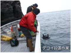 ウトロの海はご存知のとおりオホーツク海の南端に位置します。潮流も速く、また断崖付近では水深も深いため海上設置型のデコイの固定は技術的に難しい要素が多々あります。もちろん主要な漁獲を占めるサケ・マスの定置網漁業の障害となることも避けなければなりません。平成23年(2011年)から始まったケイマフリデコイの設置に際し、ウトロ漁業協同組合からはデコイ設置のための技術的なアドバイスと設置作業協力、設置のための資材提供がありました。オホーツクの海を生きる生き物への優しさと、同じ海を生活の場とするウトロ漁師の心意気がケイマフリ保護活動を支えています。